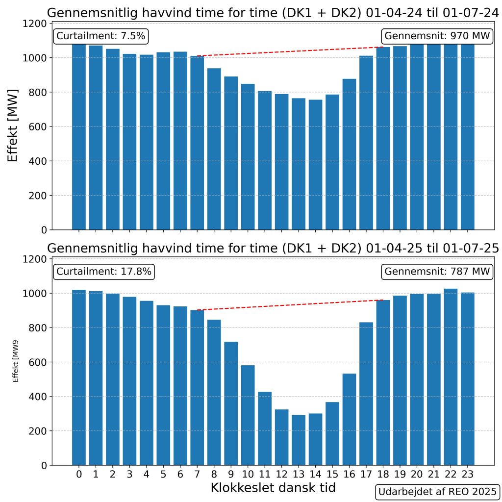 Midt på dagen lukker havvind ned, fordi solcellerne producerer på højtryk. Den elektriske energi kan ikke aftages. Figuren viser den gennemsnitlige produktion time for time i 2. kvartal 2024 og 2025. Tilbage i 2018, før solcellernes indtog, var havvind produktionen i gennemsnit næsten konstant over hele døgnet.