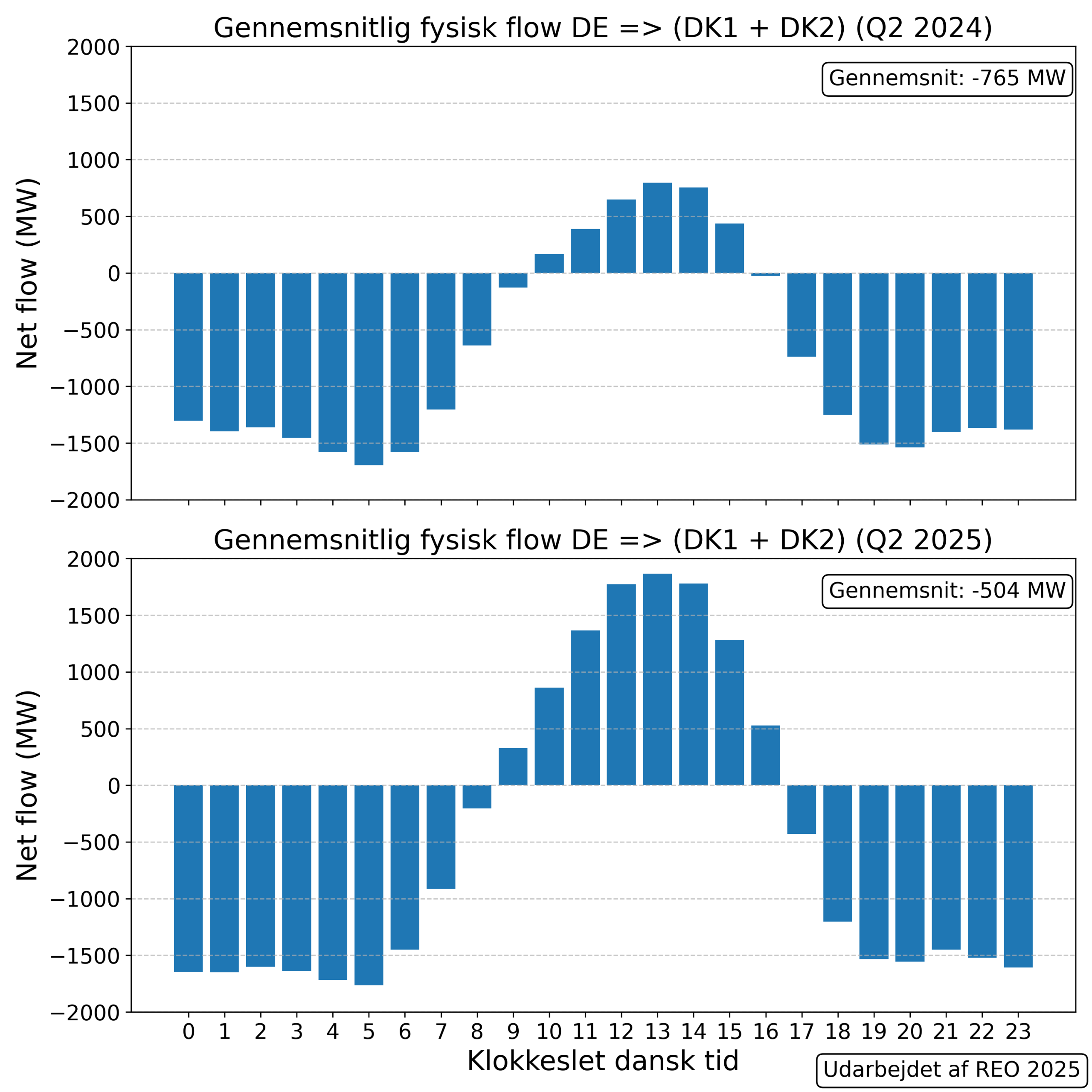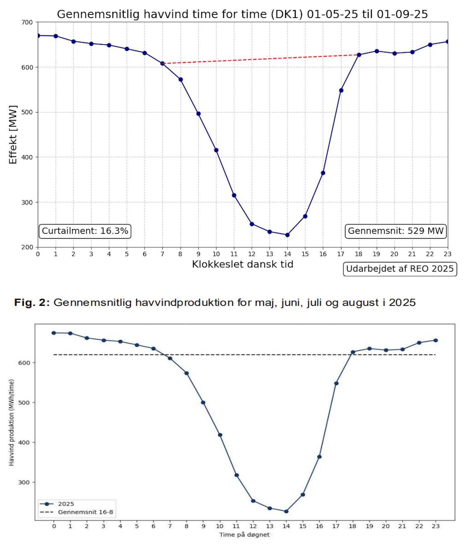Midt på dagen lukker havvind ned, fordi solcellerne producerer på højtryk. Den elektriske energi kan ikke aftages. Figuren viser den gennemsnitlige produktion time for time i 2. kvartal 2024 og 2025. Tilbage i 2018, før solcellernes indtog, var havvind produktionen i gennemsnit næsten konstant over hele døgnet.